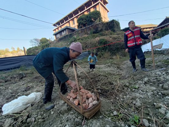 田間地頭,隊員們分工協(xié)作,挖薯、拾薯、裝筐,流程有序。大家彎腰俯身,揮鋤勞作,不顧泥土沾身,全力加快采收進度。勞動間隙,隊伍們還耐心詢問農(nóng)戶近期的生活狀況,叮囑其注意保暖、保重身體。經(jīng)過半天的忙碌,紅薯全部采收完畢并搬運至其家中,切實解決了農(nóng)戶的燃眉之急。