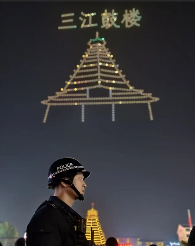璀璨夜空·科技賦能侗年新魅力。作為本次侗年的重磅亮點,無人機表演秀以天為幕,以城為景,用科技光影演繹侗鄉故事。數百架無人機在夜空中整齊列陣,變幻出鼓樓、風雨橋等特色文化標識,以及“全民反詐 你我同行”“一盔一帶 平安相伴”等璀璨字樣,實現傳統節慶、安全宣傳與現代科技的完美交融。