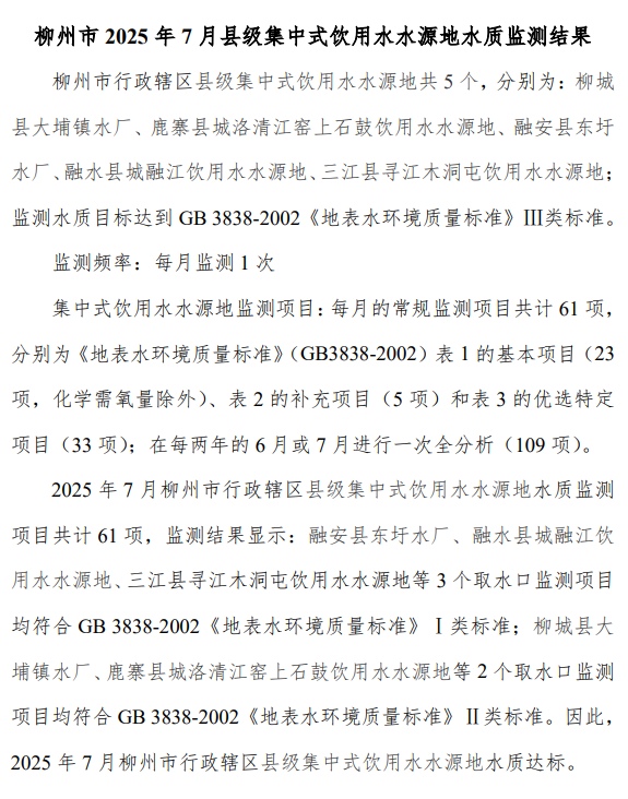 2025年7月份柳州市縣級(jí)飲用水質(zhì)量報(bào)告